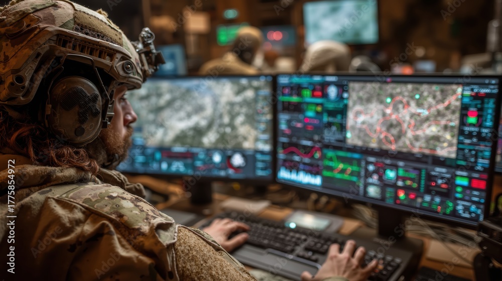 Military operations center with soldier monitoring advanced digital tactical displays #1775854972