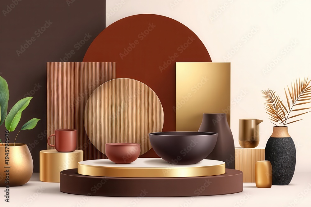 Minimalist dark brown and gold geometric still life with modern vases and bowls for decor #1945799586