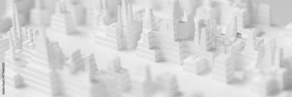 Minimalistic 3D rendering of an abstract white city skyline, featuring geometric buildings and structures, conveying a sense of urban development, planning, and clean architectural design. #1774466025