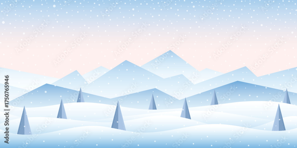 Minimalistic winter landscape, snowy peaks and snowdrifts and snowfall, cartoon nature, vector illustration #1750765946