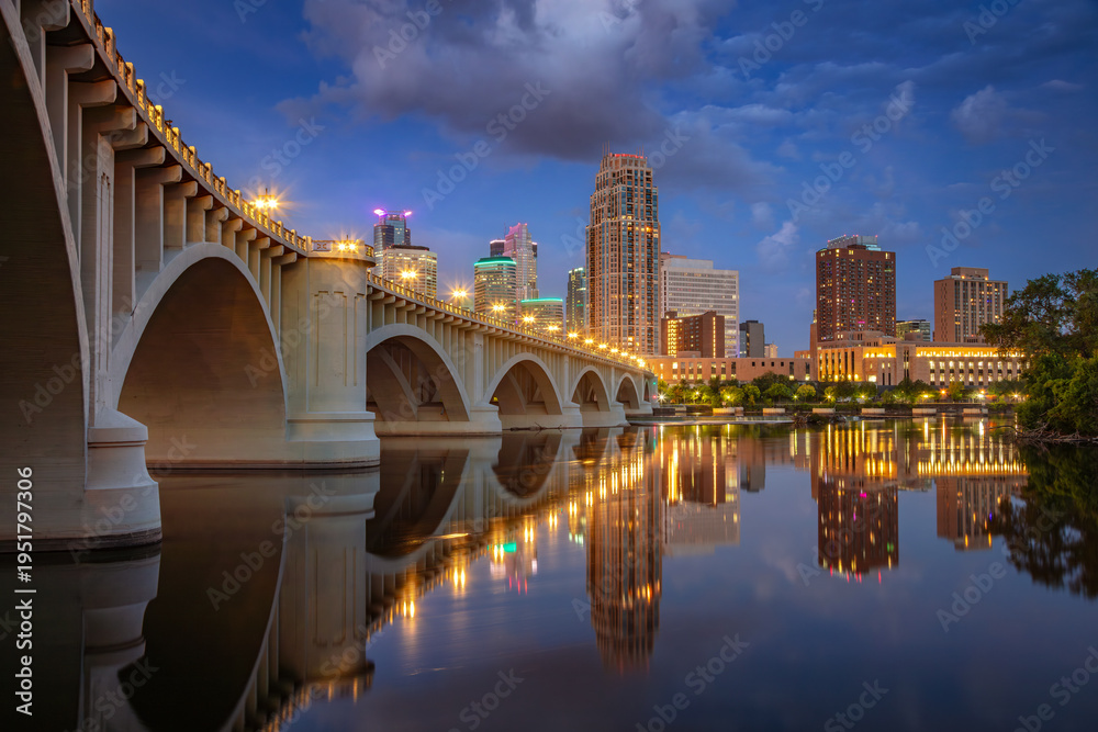 Minneapolis, Minnesota, USA. Cityscape image of downtown Minneapolis, Minnesota, USA with reflection of the city skyline in Mississippi River at twilight blue hour. #1951797306