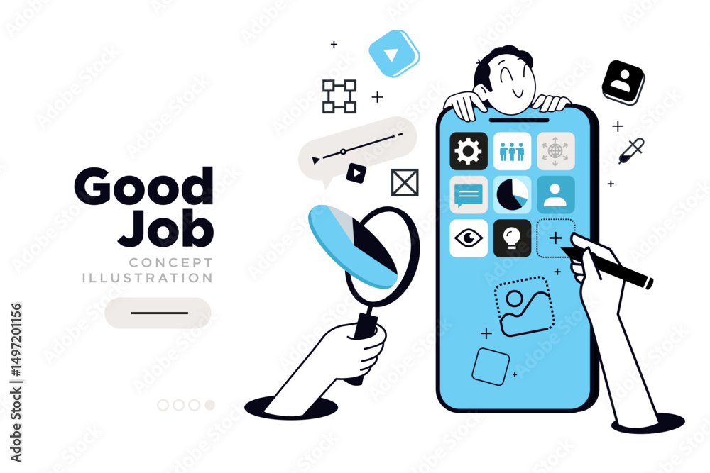 Mobile apps and services. Vector illustration for website page design, web banner, social media banner, business presentation, marketing material. #1497201156