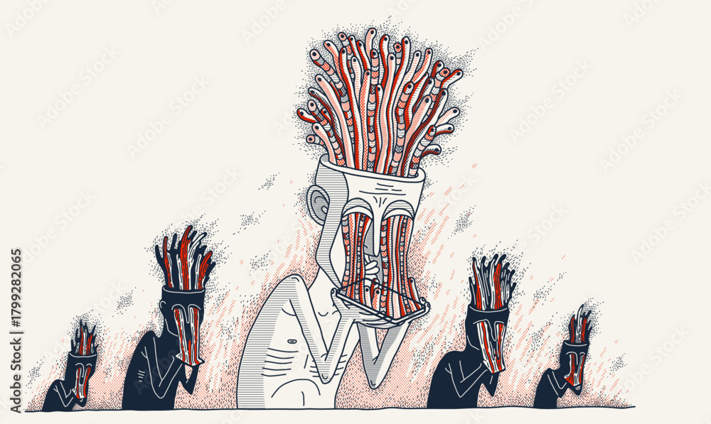 Mobile phone internet addiction, vector illustration of addicted man holding a phone with worms growing from it, brain damaging and degradation. #1799282065