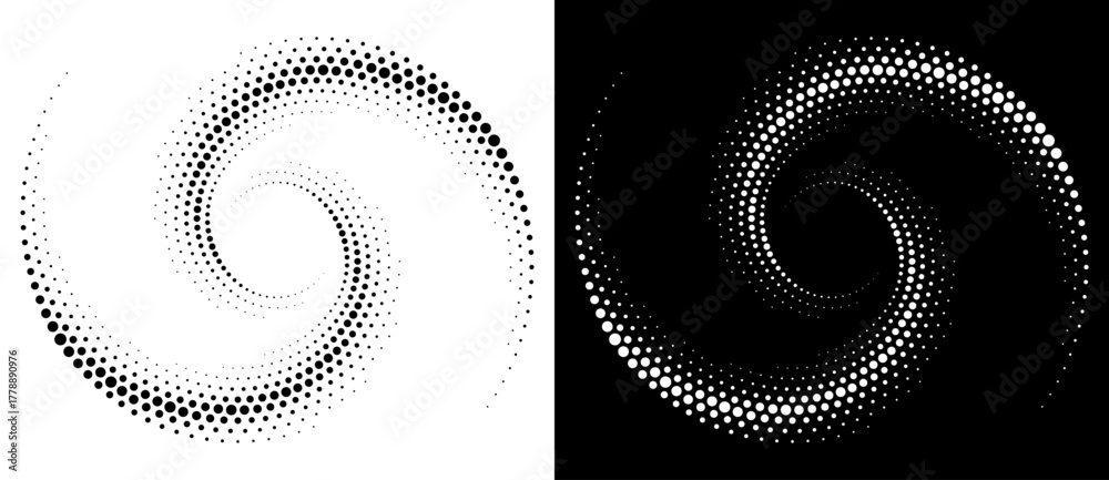 Modern abstract background. Halftone dots in circle form. Round logo. Vector dotted frame. Design element or icon, logo. Black shape on a white background and the same white shape on the black side. #1778890976