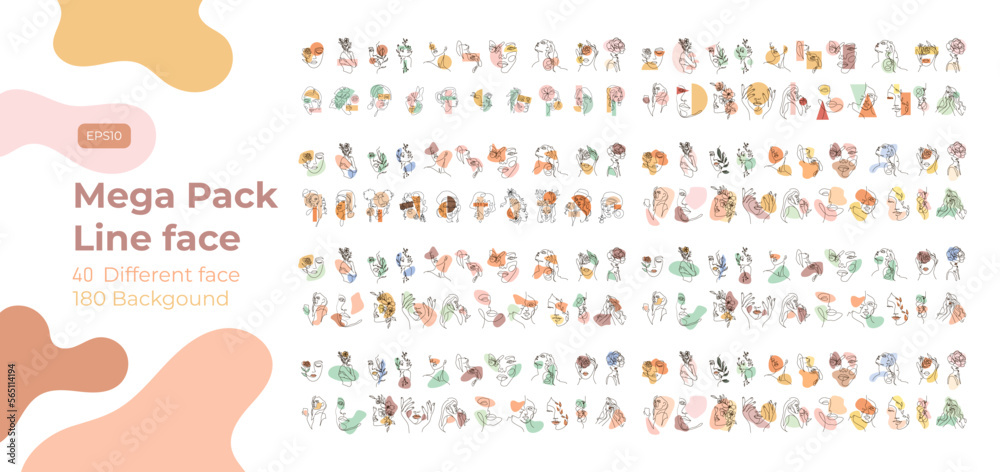 Modern abstract line minimalistic women faces arts set with different shapes for wall decoration, postcard or brochure cover design. Different woman faces. One line art. Mega pack #565114194