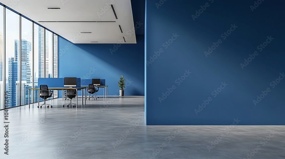 Modern blue office interior with PC computers and tables lined up on a concrete floor. Coworking space with a panoramic window offering views of Singapore skyscrapers #1041612475