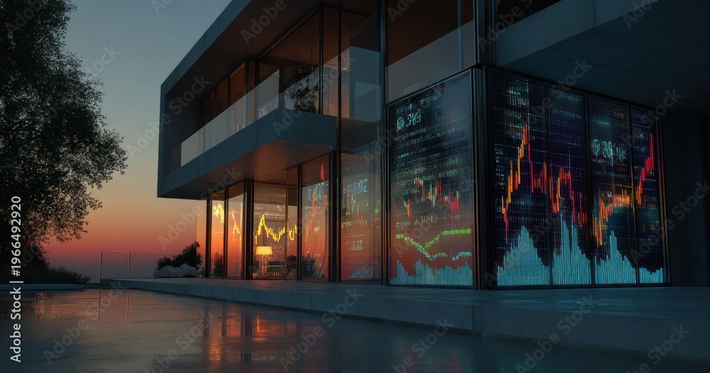 Modern house with financial data displayed on illuminated windows at sunset #1966492920