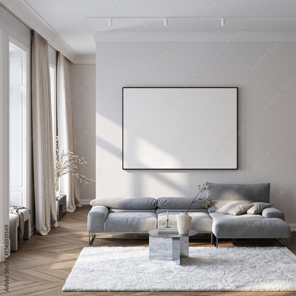 Modern Living Room Poster Frame Mockup with Natural Light and Minimalist Decoration. 3D render. #1745801149