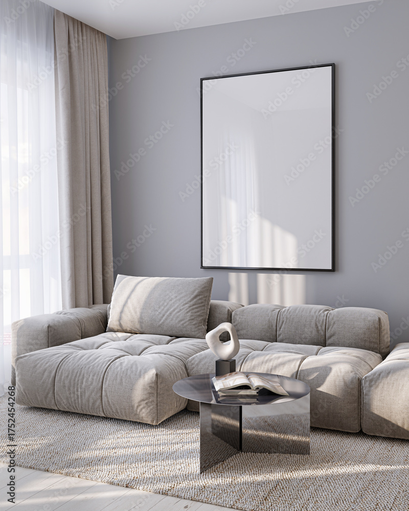 Modern Living Room Poster Frame Mockup with Natural Light and Minimalist Decoration. 3D render. #1752454268
