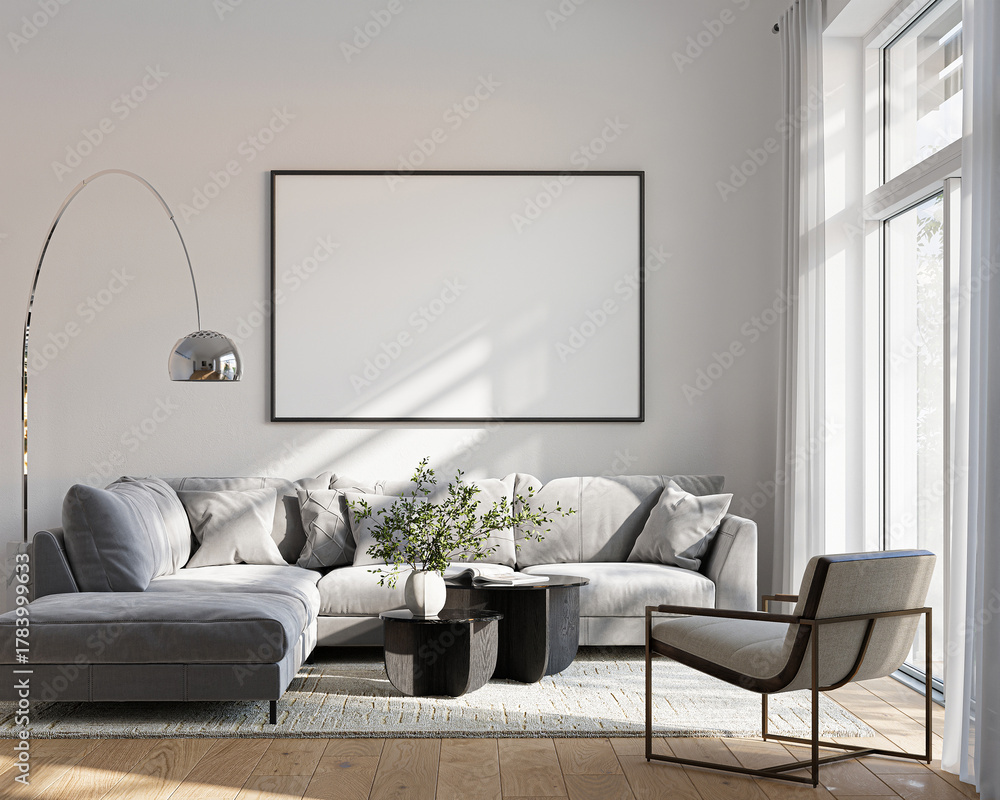 Modern Living Room Poster Frame Mockup with Natural Light and Minimalist Decoration. 3D render. #1783999633