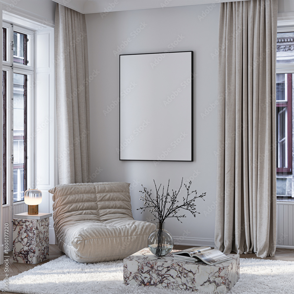 Modern Living Room Poster Frame Mockup with Natural Light and Minimalist Decoration. 3D render. #1800177220