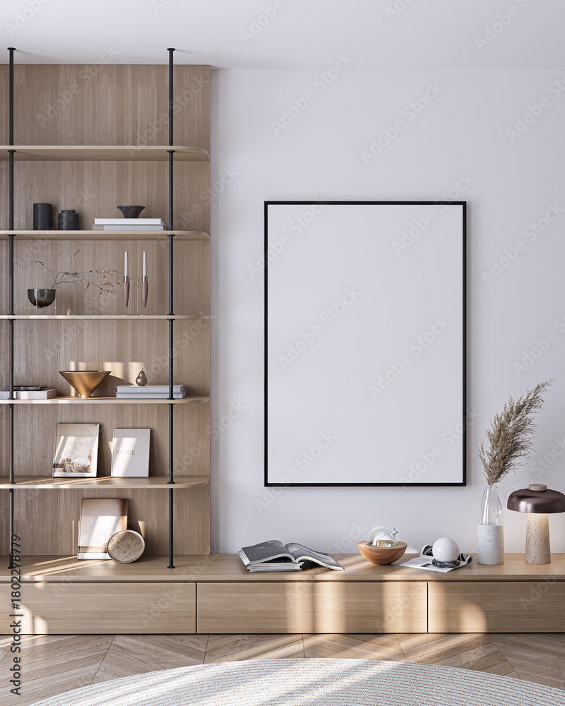 Modern Living Room Poster Frame Mockup with Natural Light and Minimalist Decoration. 3D render. #1802278779