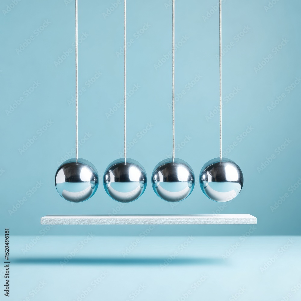 Modern Newtons Cradle with Polished Metal Spheres on Minimalist Stand Demonstrating Momentum Transfer and Systematic Thinking for Business Innovation #1520496181