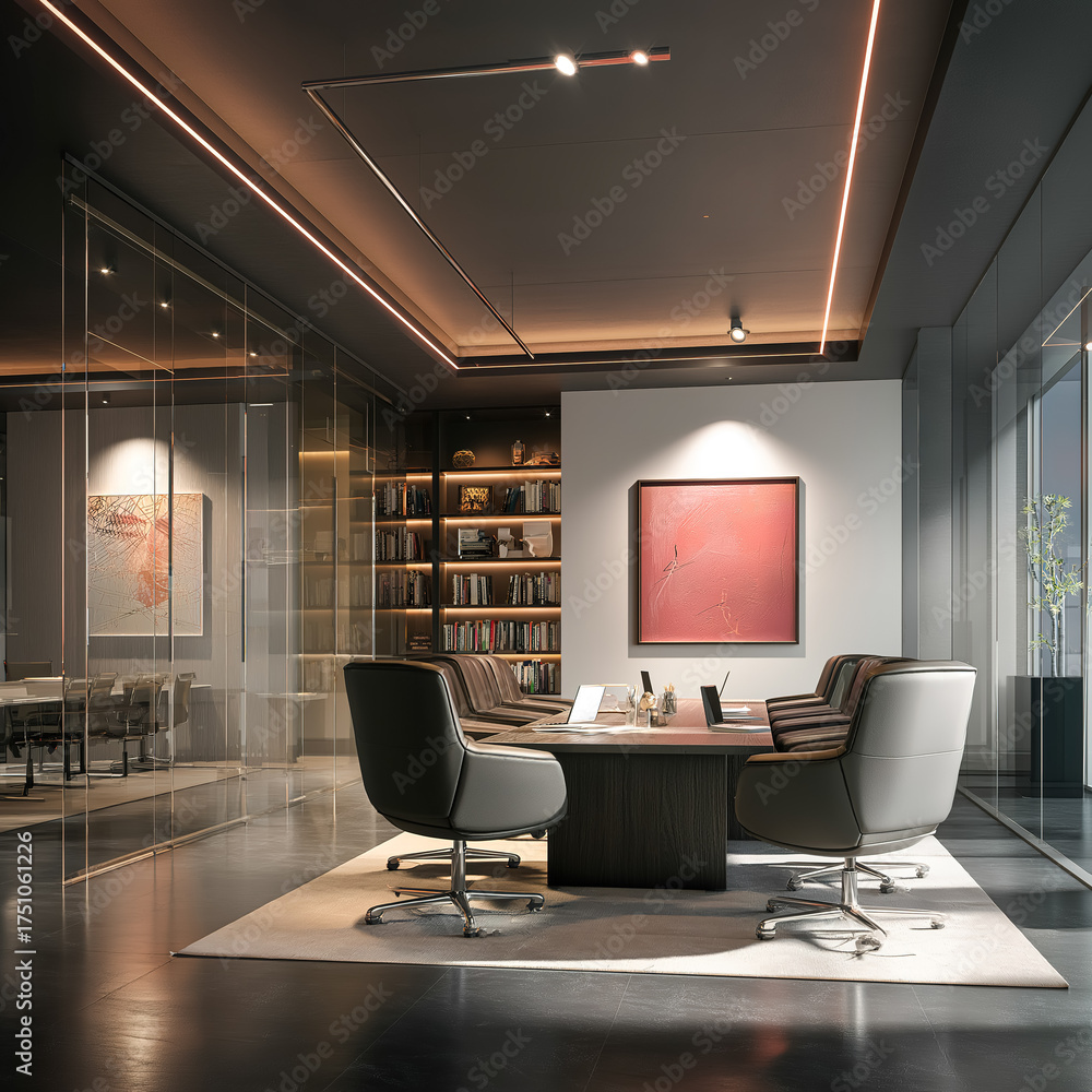 Modern office interior with comfortable seating and stylish decor for productive meetings and discussions #1751061226