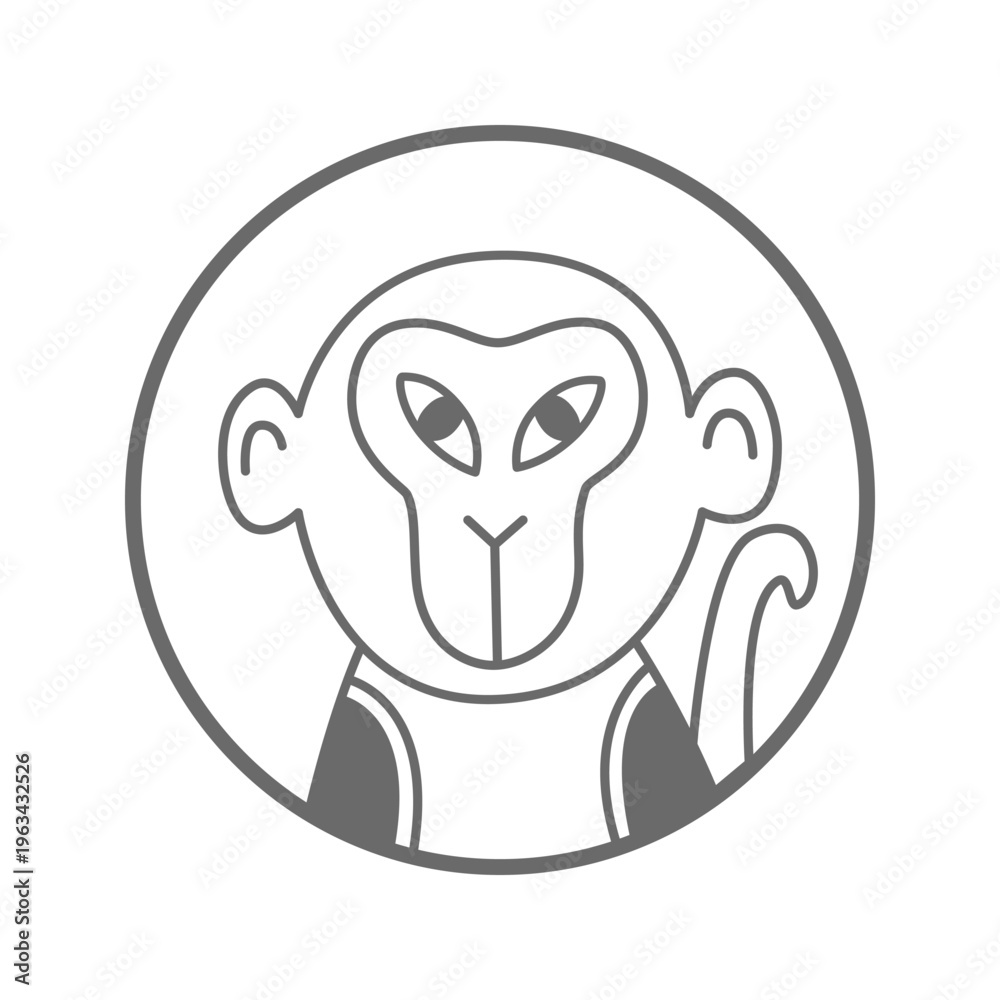 Monkey icon in circle, vector illustration, grey outline, minimalist line drawing, isolated on white background #1963432526