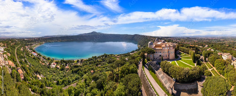 Most scenic lakes of Italy - volcanic Albano lake , aerial drone view of Castel Gandolfo village and crater of volcano. popular touristic site near Rome, famous as Pope residense #607141494