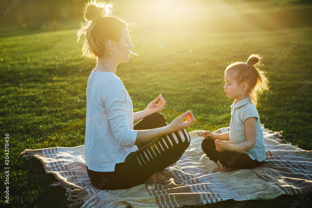 Mother practicing yoga with her daughter in the open air. #204378436