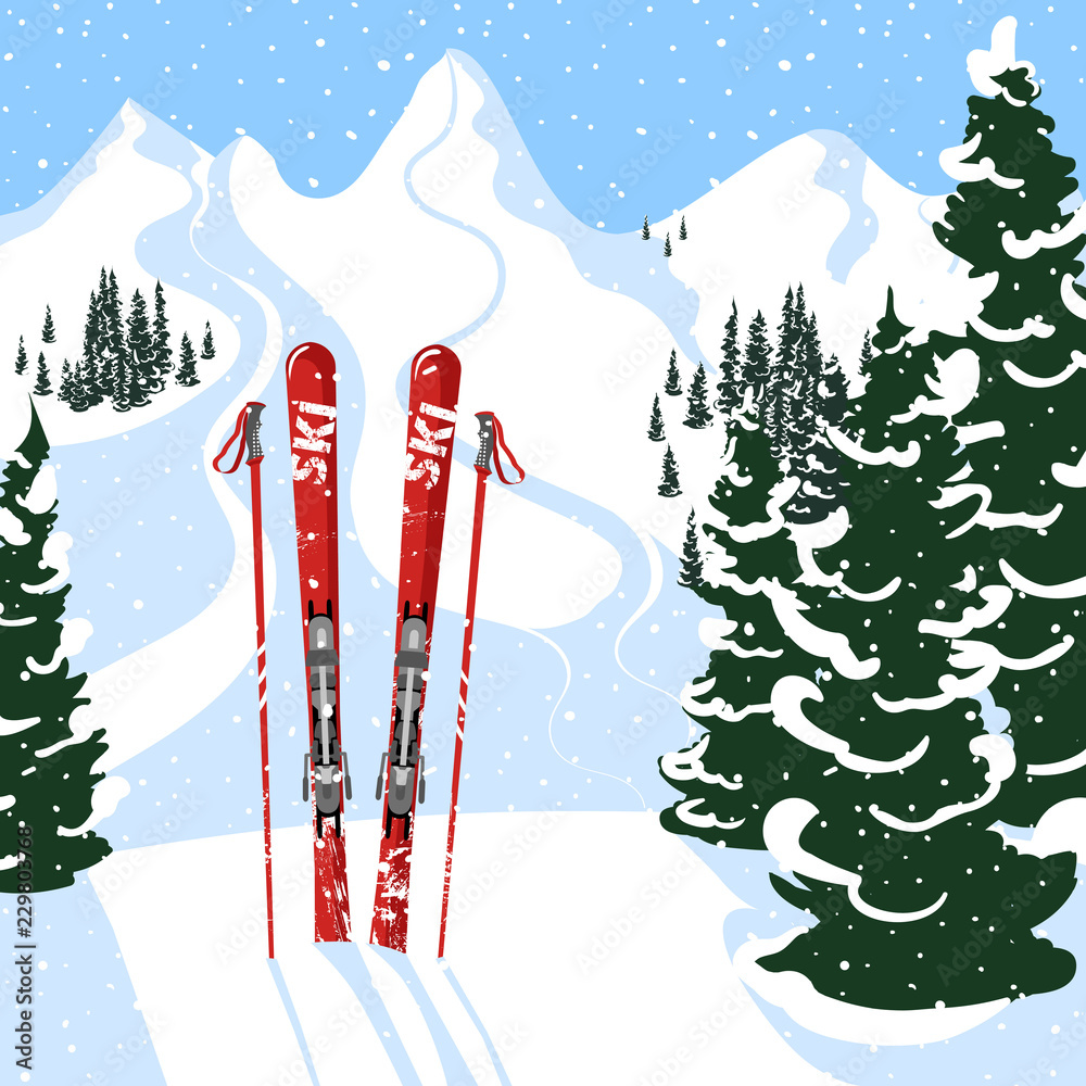 Mountain view and skis in the foreground. Winter outdoor holiday activity sport in alps, landscape with mountain view and forest. Flat style #229803768