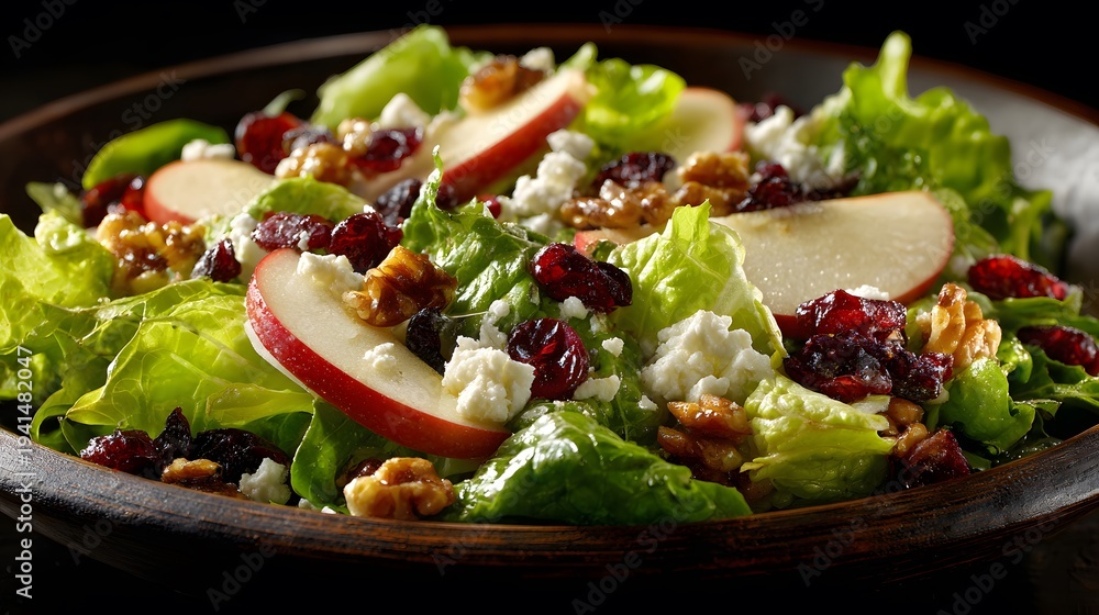 Mouth-watering food photography of a fresh green salad bursting with crisp apple slices, dried cranberries, walnuts, and fine feta cheese. #1941482047