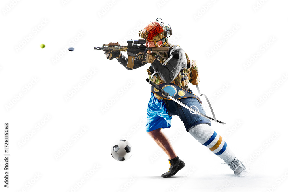 Multi sports. Boxing, gym, soccer, basketball, cycling, ice hockey, fitness, american football, skateboarding, baseball, volleyball etc. Funny collage of many kinds of sports and hobbies in one person #1726115063