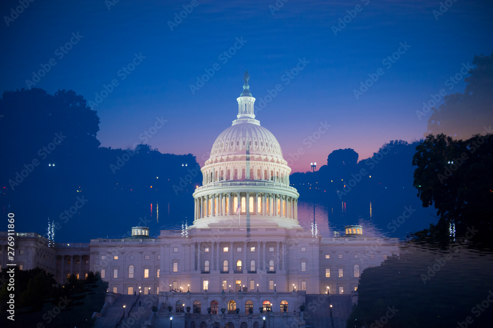 Multiple exposure view of the US Capitol Building aligned with the Washington Monument under colorful sunset DC sky #276911860