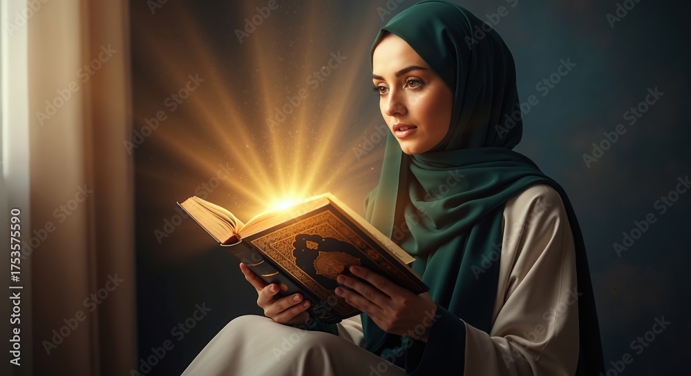 Muslim woman in hijab reading holy Quran. Sacred book glows with divine golden light. Islamic faith, spirituality, and devotion concept for Ramadan #1753575590