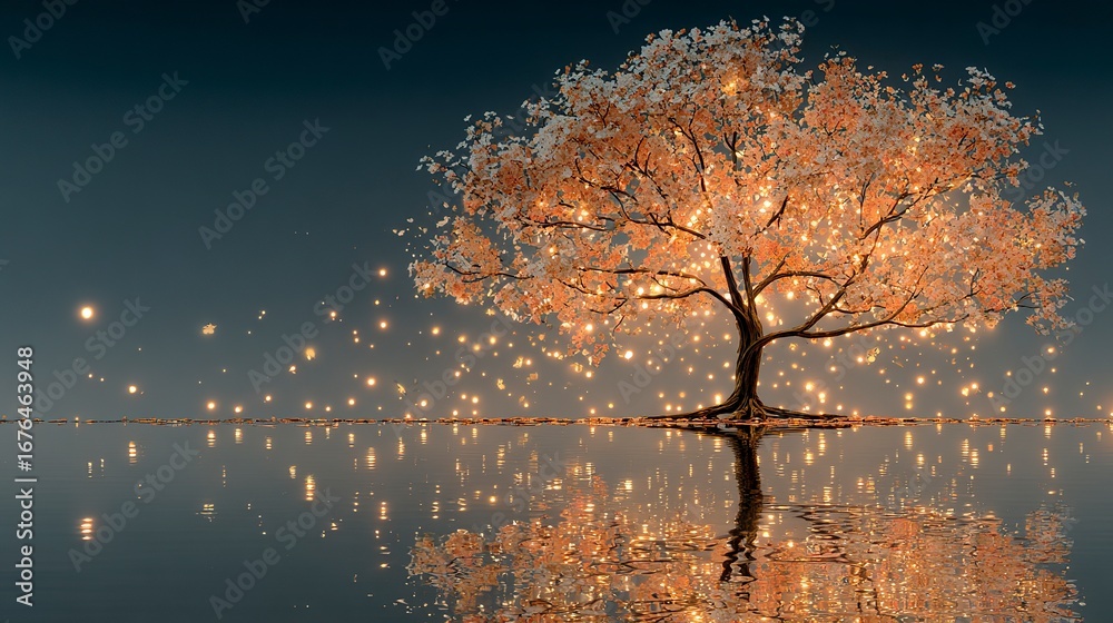 Mystical autumn night with a glowing full moon above a grand tree, golden leaves falling gently over shimmering water #1676463948