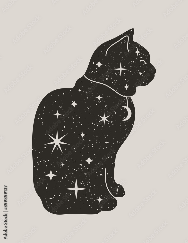 Mystical Black Cat in Trendy boho style. Vector magic cat silhouette with stars and Moon for printing on wall, T-shirt, tattoo, social media post and stories #399899137