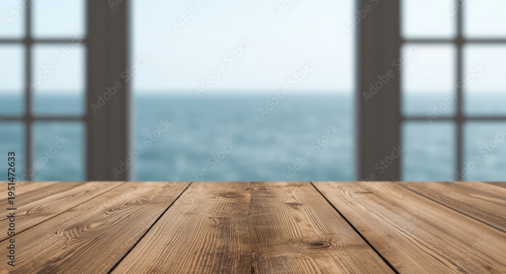Natural light and blurred ocean visible through window behind wooden plank table copy space #1951472633