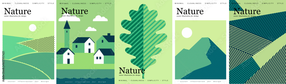 Nature and landscape. Vector modern geometric illustration of mountain, houses and tower, village, eco farm, agricultural fields, top view, line art, oak leaf, for poster, background or cover #1637957621