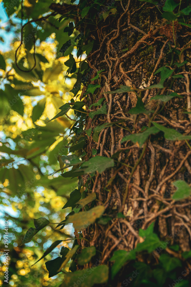 Nature detail. Creepers on tree trunk with unfocused background in autumn. Hervas, Caceres. Spain #297164182