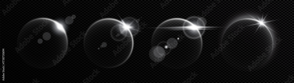 Neon solar moon eclipse effect with glowing light flares, creating a shining ring around a round moon-like sphere. The circular halo radiates with vibrant shine, cosmic atmosphere in space, vector. #1738730694
