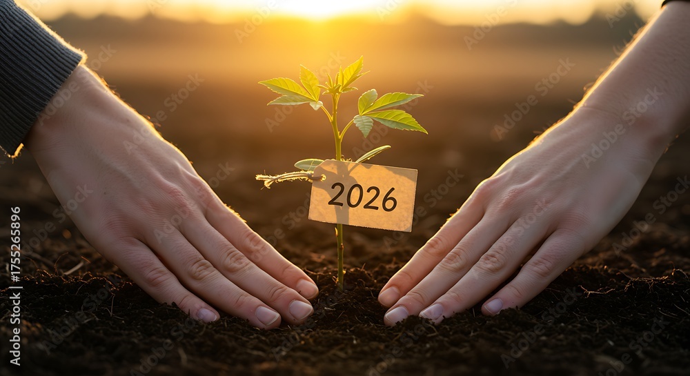 New Beginnings Concept – Hands Nurturing a 2026 Sapling at Sunrise #1755265896