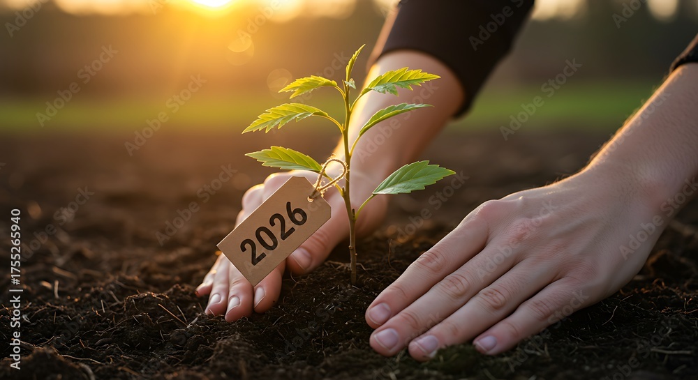 New Beginnings Concept – Hands Nurturing a 2026 Sapling at Sunrise #1755265940