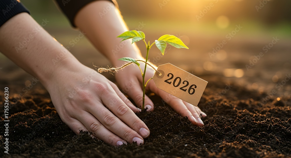 New Beginnings Concept – Hands Nurturing a 2026 Sapling at Sunrise #1755266230