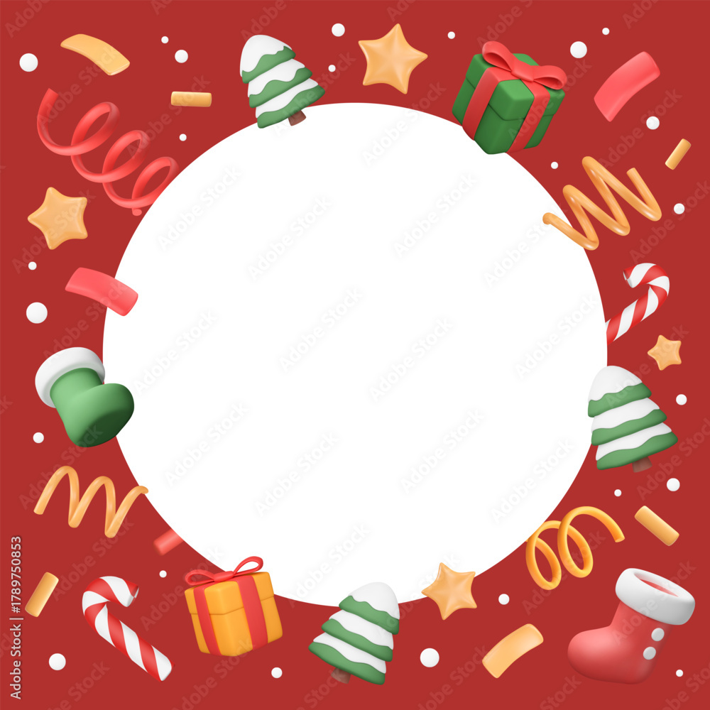 New Year frame with cartoon 3d elements, party popper and confetti. Christmas banner with copy space, invitation template, greeting card. Vector illustration. Colorful objects, holiday explosion. #1789750853