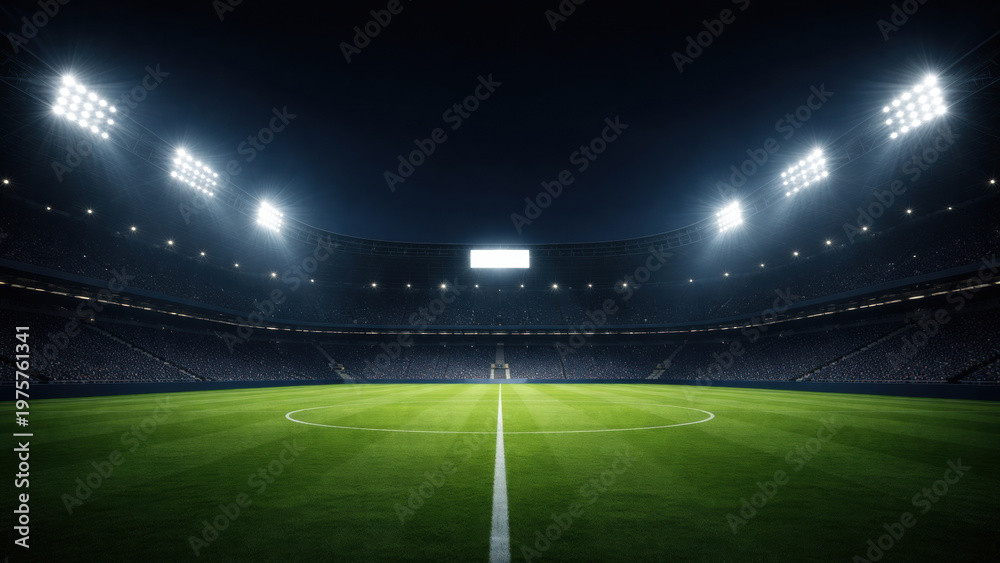 Night football stadium with bright lights and empty green field. Concept of professional sport venue, competition atmosphere, event background, dramatic lighting. #1975761341