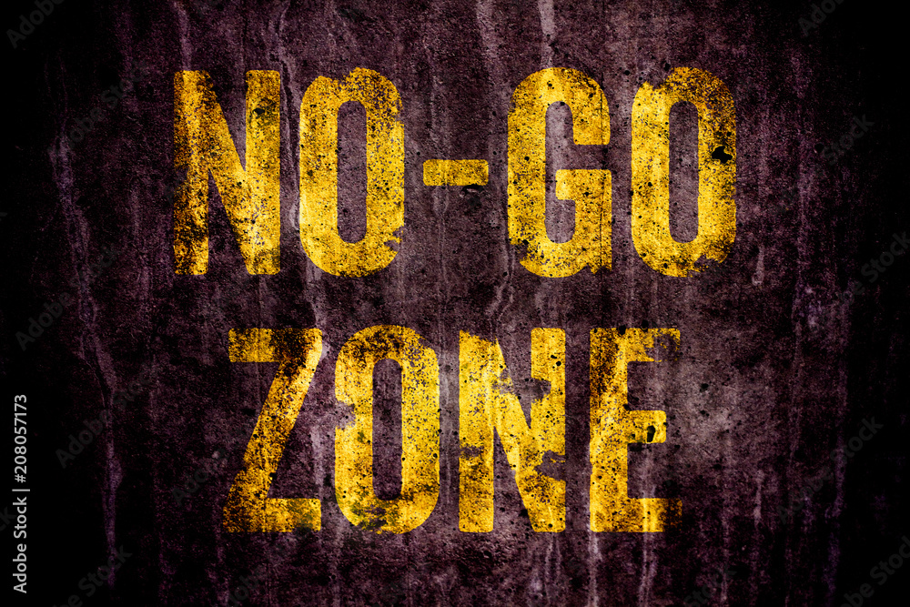 “No-Go Zone” warning sign in yellow letters painted over dark grungy concrete wall texture background. Sign as concept for: do not enter the area, caution, danger or off limits in violent urban areas #208057173