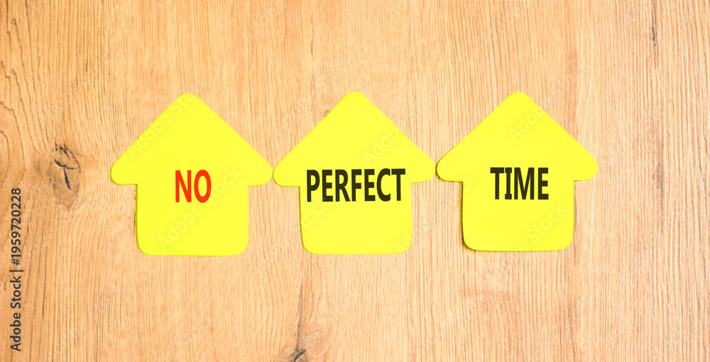 No perfect time words symbol. Concept words No perfect time on beautiful yellow paper houses. Beautiful wooden background. Business and no perfect time concept. Copy space. #1959720228