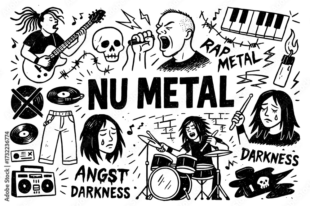 Nu metal doodle with aggressive singer, dj turntable, guitar, skulls, chains and heavy riffs symbols, Transparent Background #1732236774