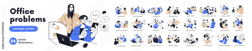Office problems set. Troubles in business communication, difficulties at work, crisis, mistakes, harassment and conflict among employees, workers. Flat vector illustration isolated on white background #1749440341