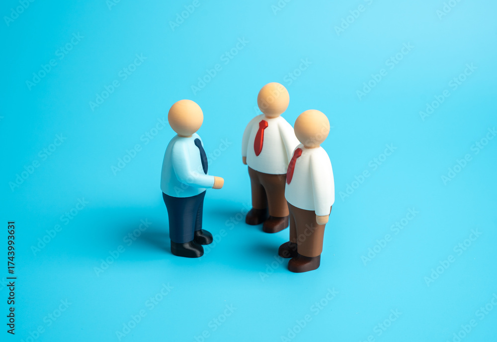 Office workers in a quick chat. Business meeting, discussing work matters. Communication and office work organization. Concept of collaboration, teamwork, project discussion #1743993631