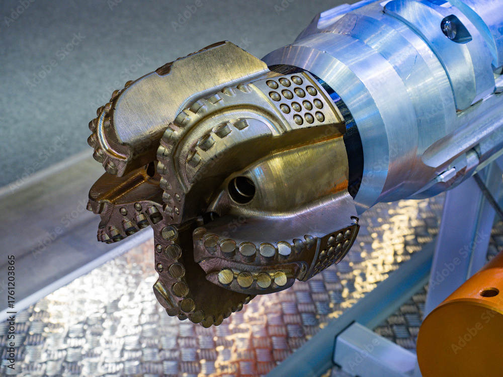 Oil and gas industry shows drilling bit tool for borehole excavation, heavy-duty equipment used in mining, geology and petroleum exploration. #1761203865