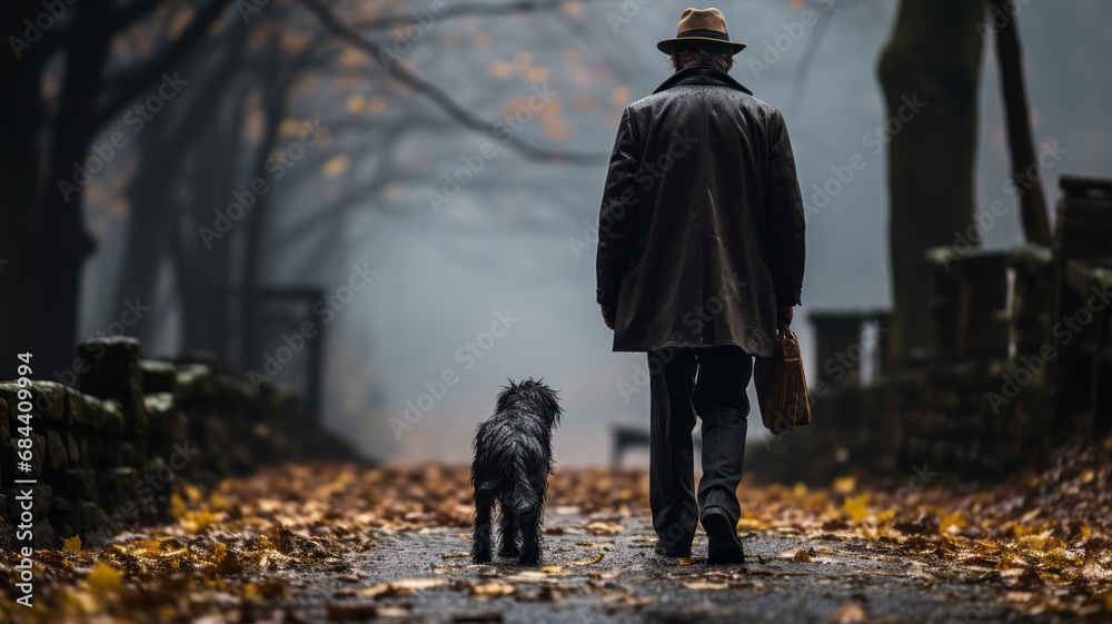 old man walking alone with his dog, on a rainy day, lonely person #684409994