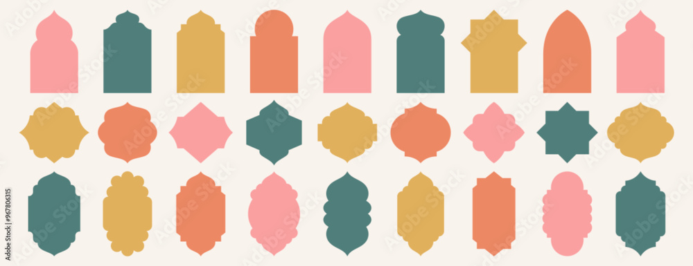 Old mosque windows shape in oriental style. Islamic door set, flat arabic frames or arabian arches silhouette. Muslim architecture geometric design elements, moroccan minimal arcs. Ramadan kareem gate #967806315