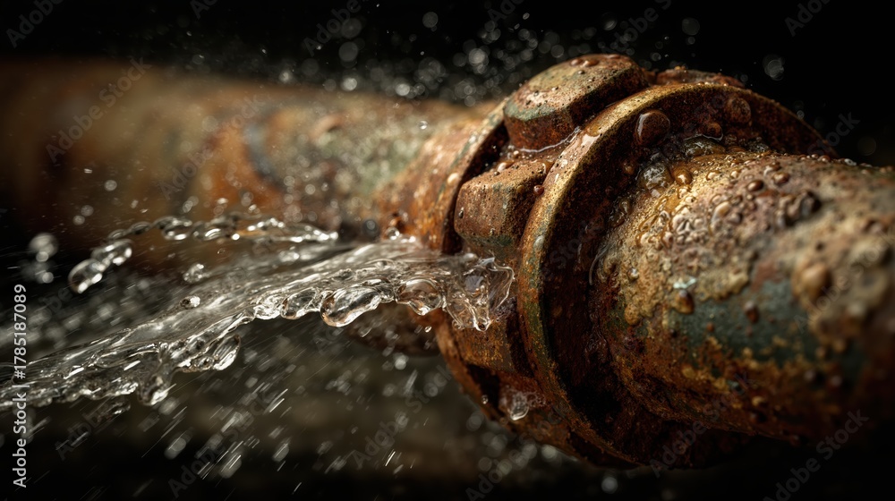 Old rusty pipe joint leaking water dramatically amidst dark background #1785187089