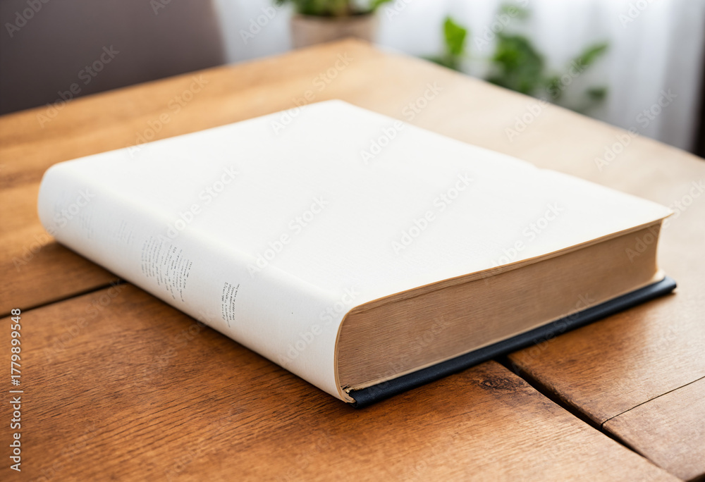 old thick book with white dust jacket mockup on wooden table #1779899548