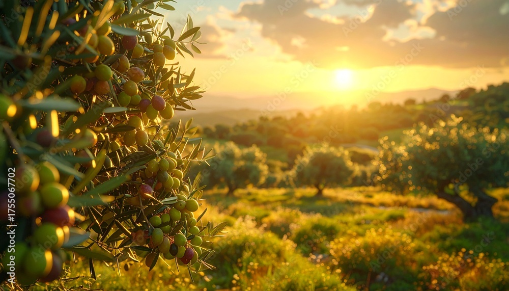 Olive tree plantation at sunset with golden light over green hills #1755067702