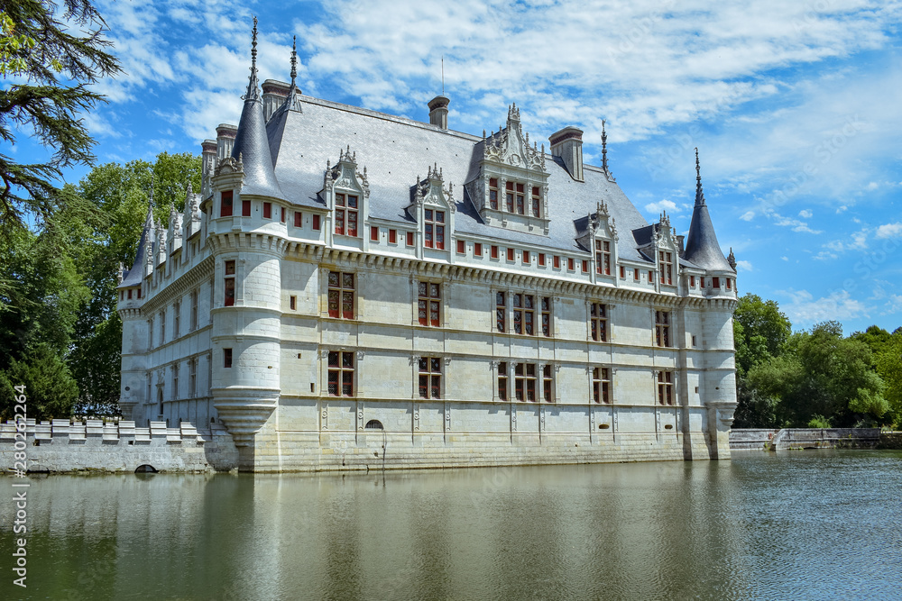 One of the earliest French Renaissance castle. Built on an island in the Indre River. Sunny day in summertime at Azay le Rideau castle, France on July 06, 2017 #280262264