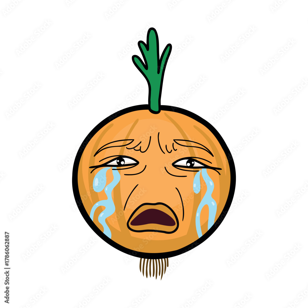 Onion with a crying face on white background, Cartoon flat style. #1786062887